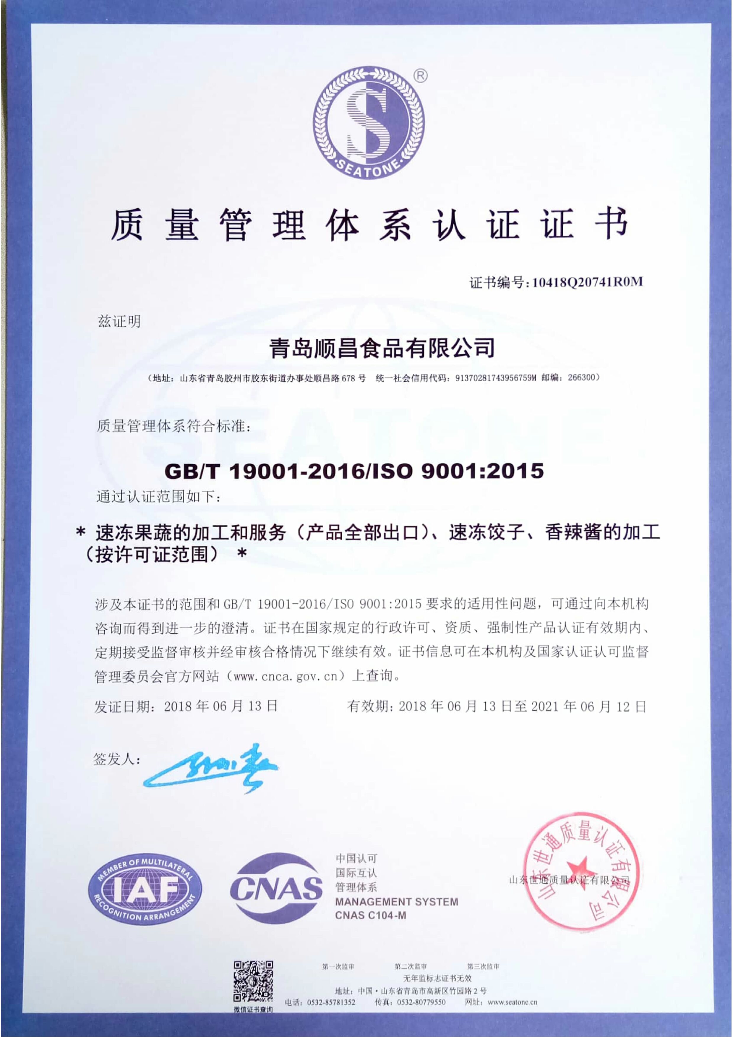 品質(zhì)管理システム証明書